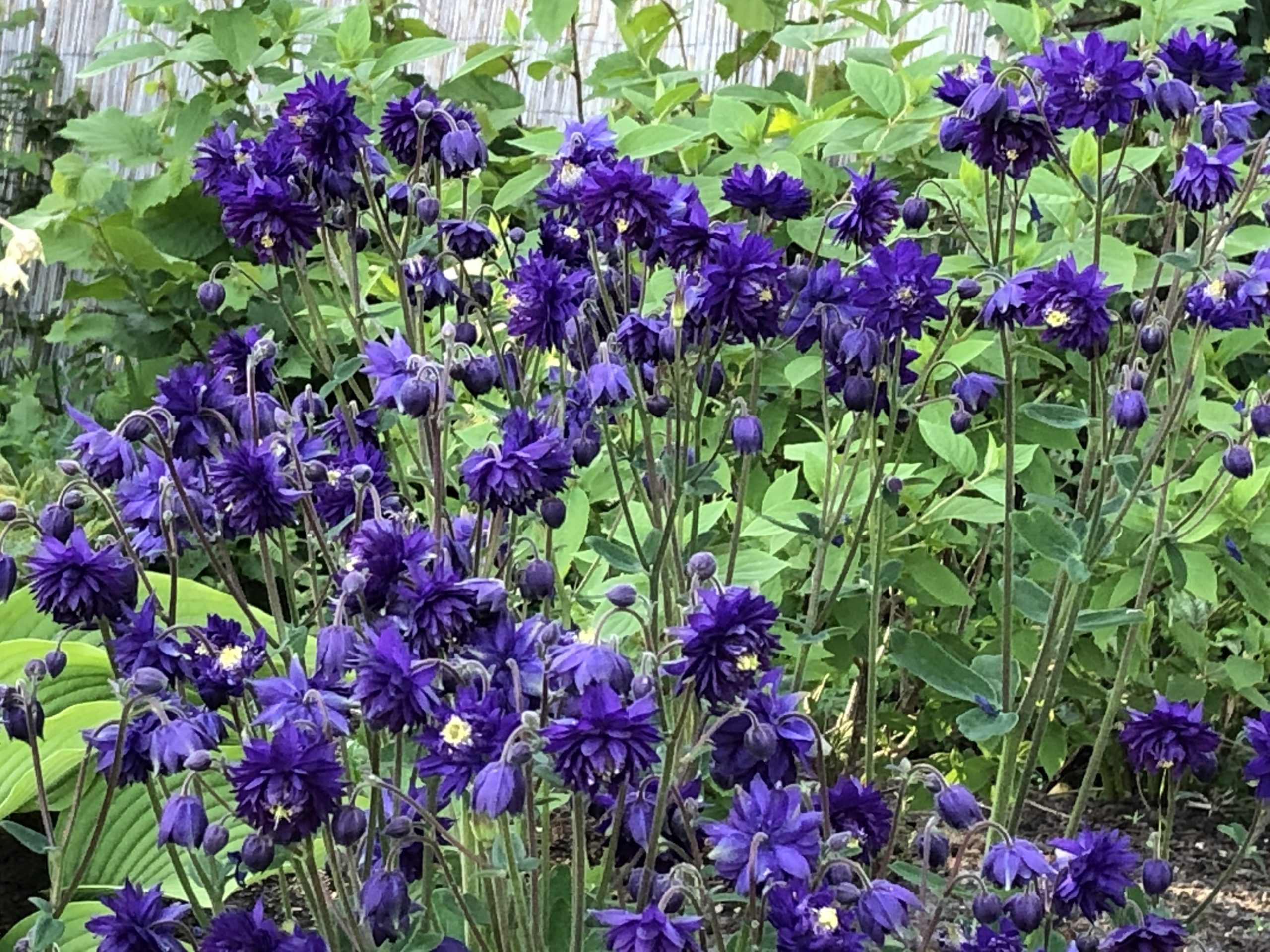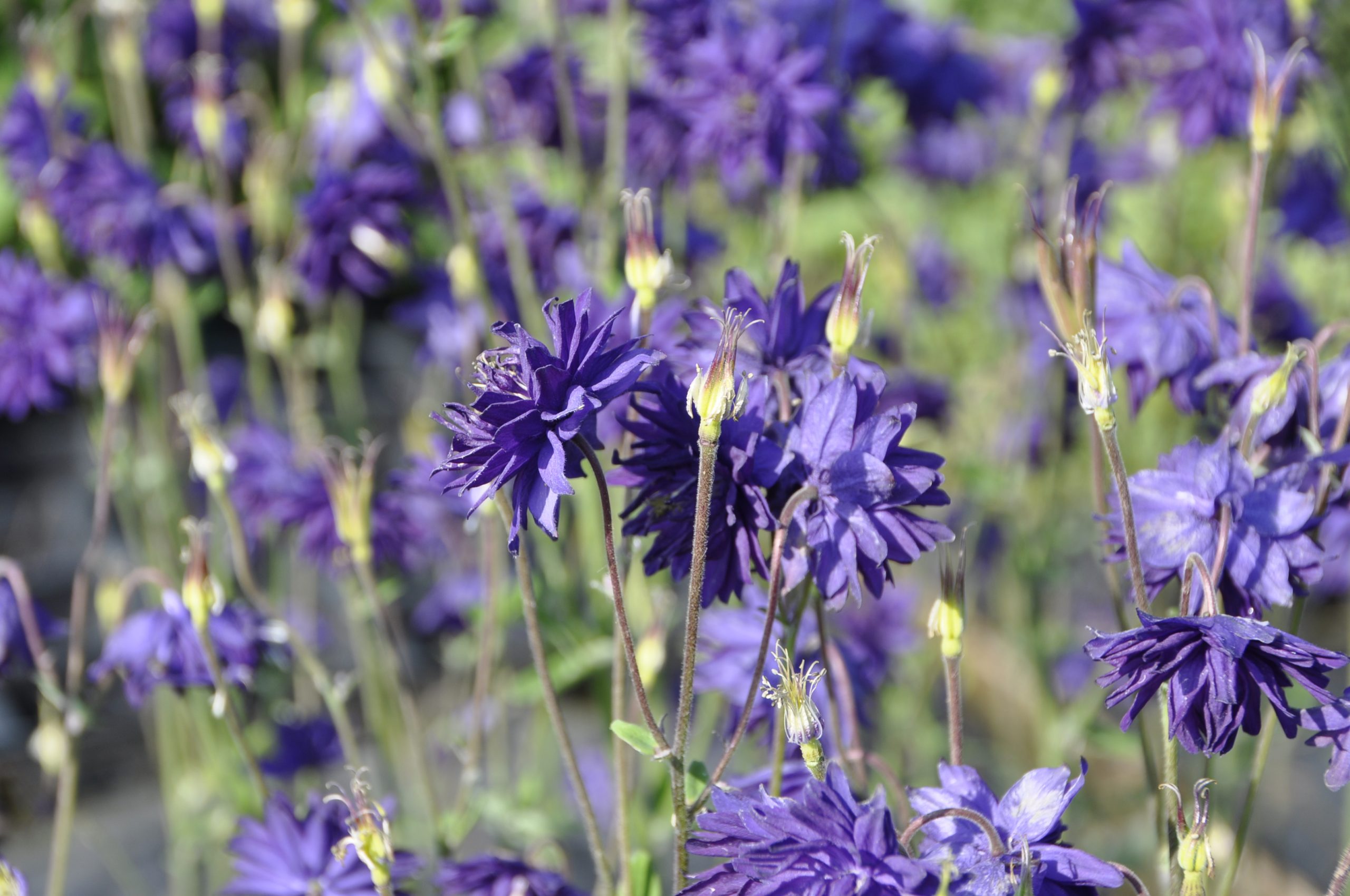 blau-violett, gefüllt, V-VII, 70 cm, Blatt grün, sonnig bis halbschattig, mittel, versamend; horstig, Pflanzabstand 35 cm