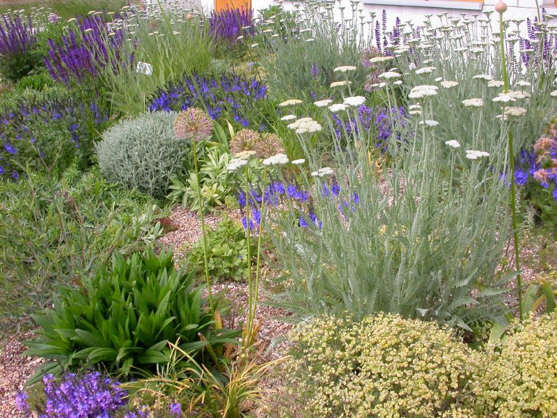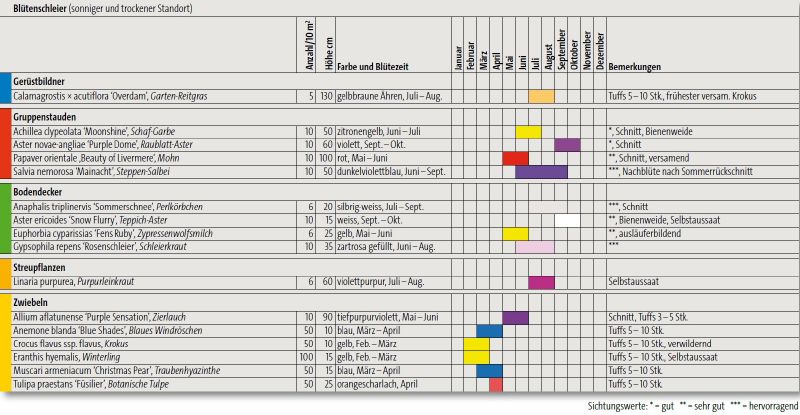 Lockere, aber farbkräftig wirkende Staudenkomposition mit einigen graulaubigen Arten. Sehr repräsentative Mischung, die sich auch für den Privatgarten empfiehlt.