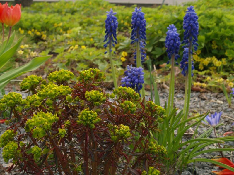 Die gelben und blauen Blüten sorgen für einen frischen Frühjahraspekt. Die kontrastreichen orangeroten Farbtupfer werden in Sommer von hellgelb und violettblau abgelöst, umwoben vom zartrosa Blütenschleier der Gypsophila. Formstabile Spätblüher sorgen für einen ansprechenden Winteraspekt.