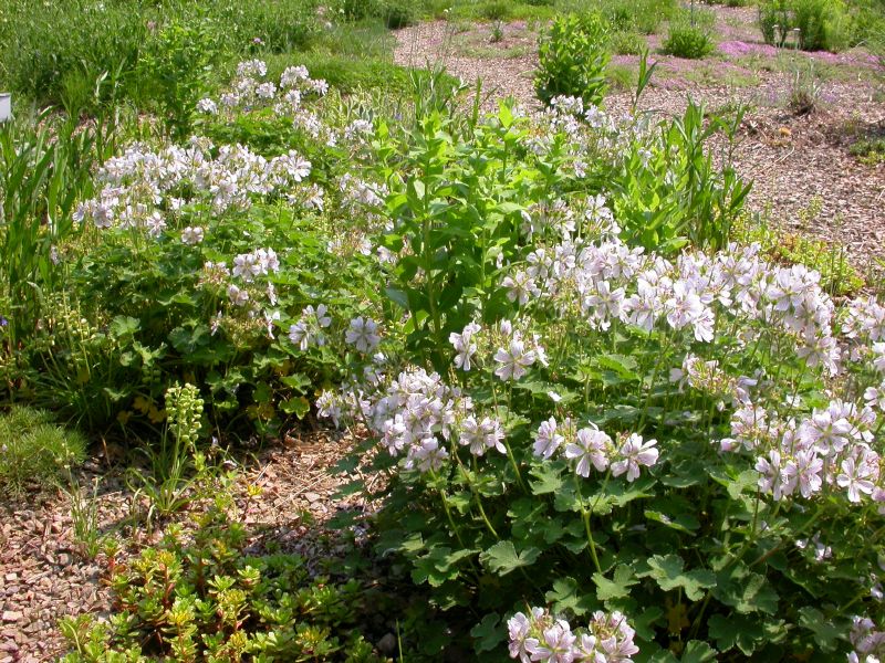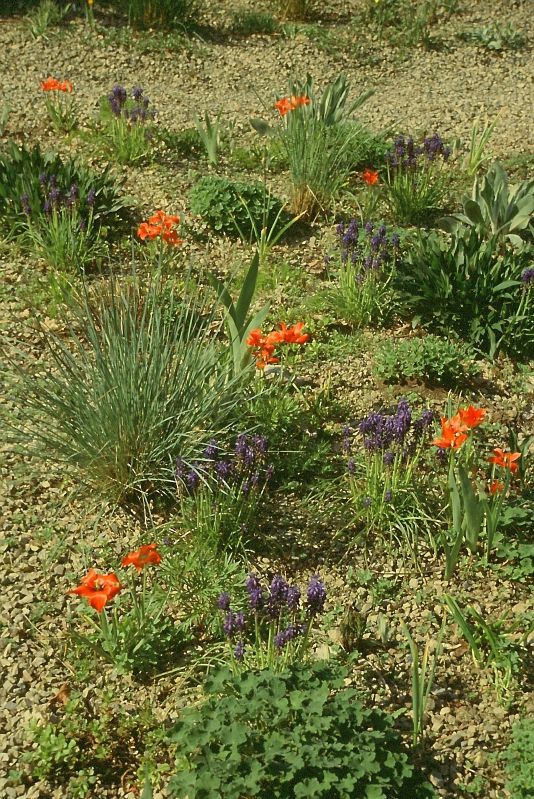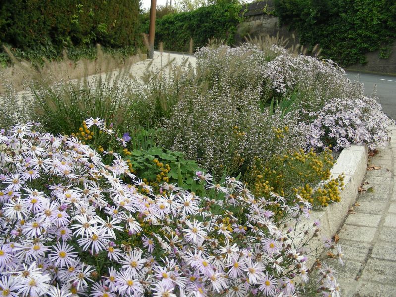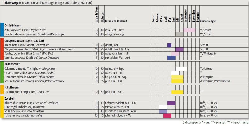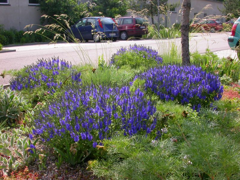 Kräftiges rotbraun in der Blüte steht im Kontrast zu zartem Rosa und hellem Violett. Silbriges, behaartes Laub wird ergänzt durch das satte grün der Polsterfetthenne. Die Auswahl der Stauden ist klar von dem Hintergrund der Verwendung in trockenen Bereichen erfolgt und bringt einen lockeres, kontrastreiches Blatt- und Blütenspiel mit sich.
