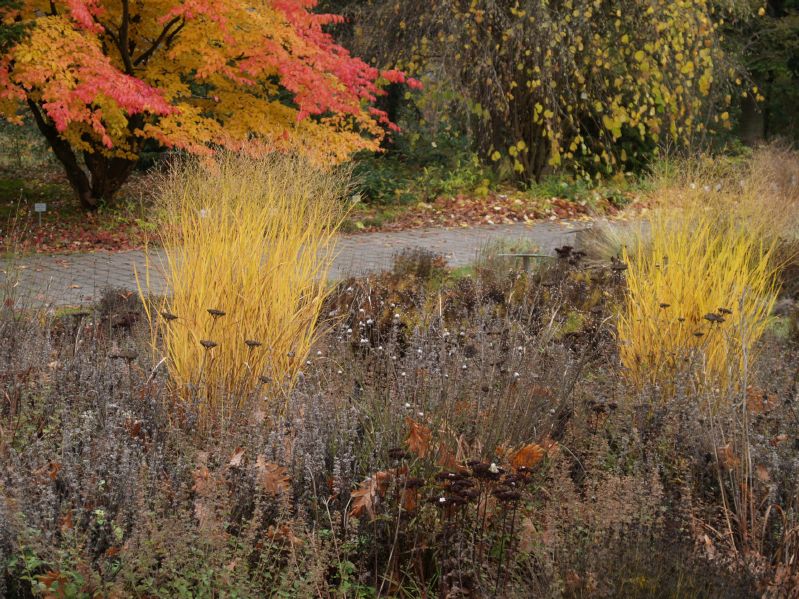 Staudenkomposition mit wechselnden Farben, dominierend sind jedoch gelb und blau. Durch verschieden hohe Stauden und Gräser ist auch das Winterbild sehr attraktiv.