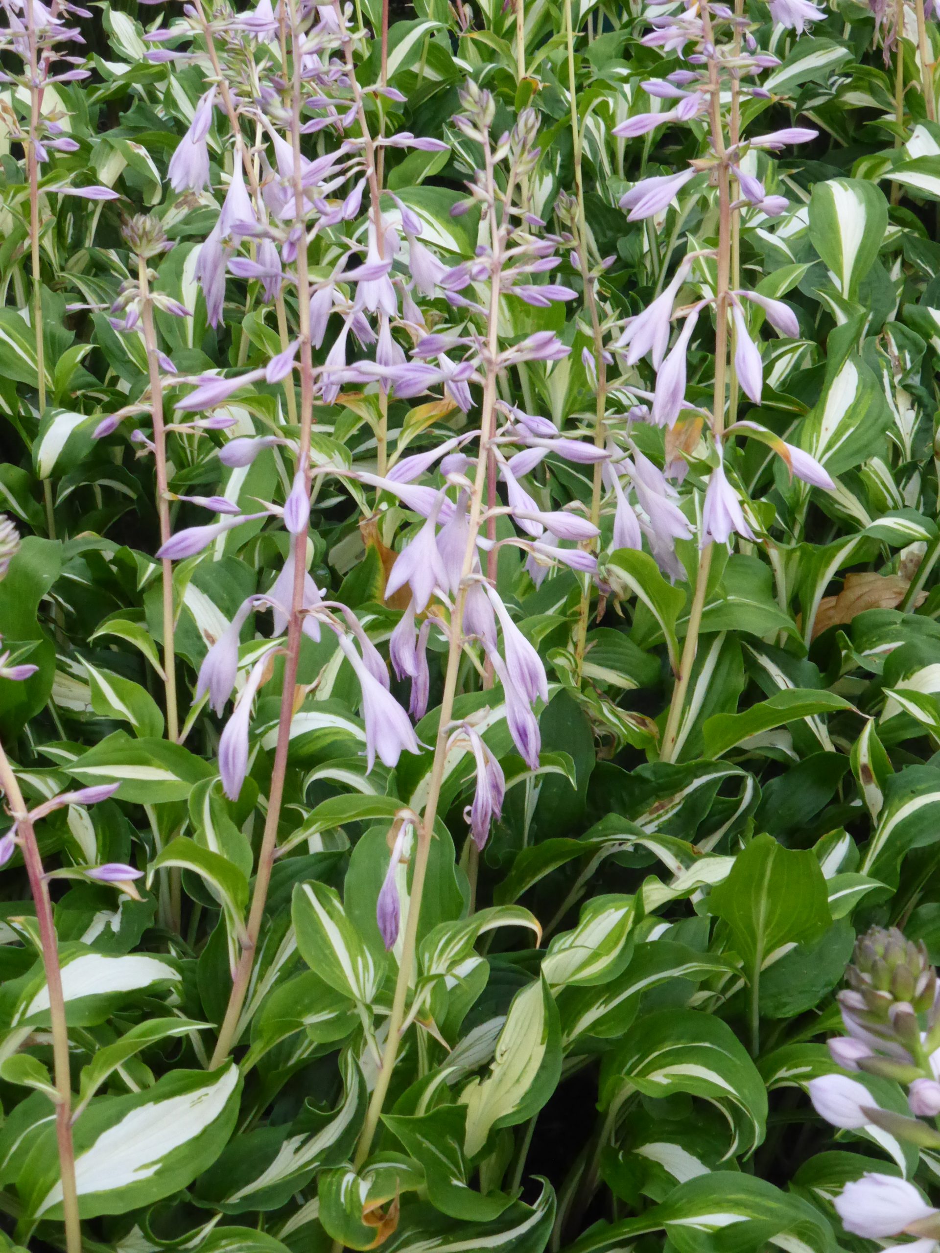 hell-violett, VI-VII, 45 cm, Blatt grün, schmale weiße Mitte, halbschattig, mittel, horstig, Pflanzabstand 40 cm