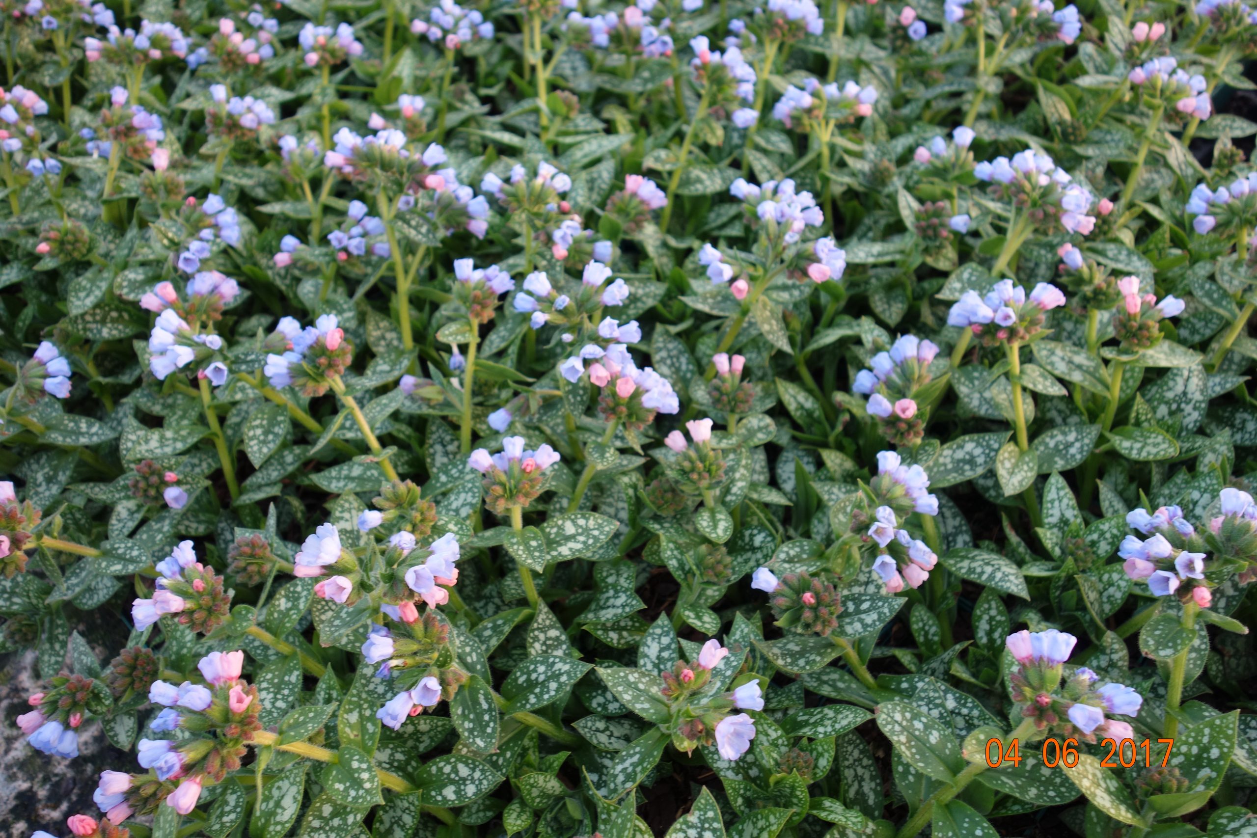 blau bis violett, III-V, 30 cm, Blatt grün, silbrig gefleckt, halbschattig bis schattig, mittel, horstig, Pflanzabstand 35 cm
