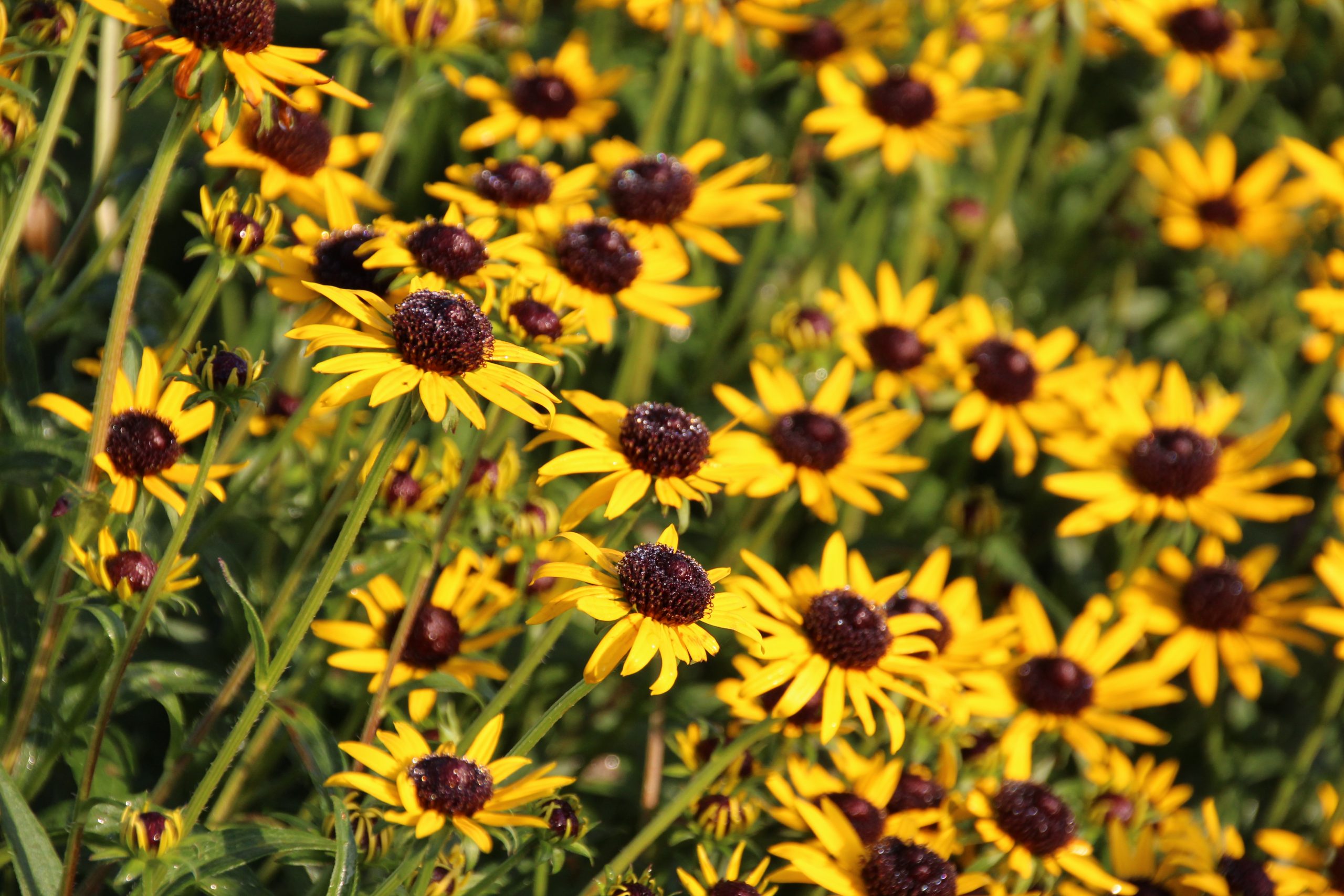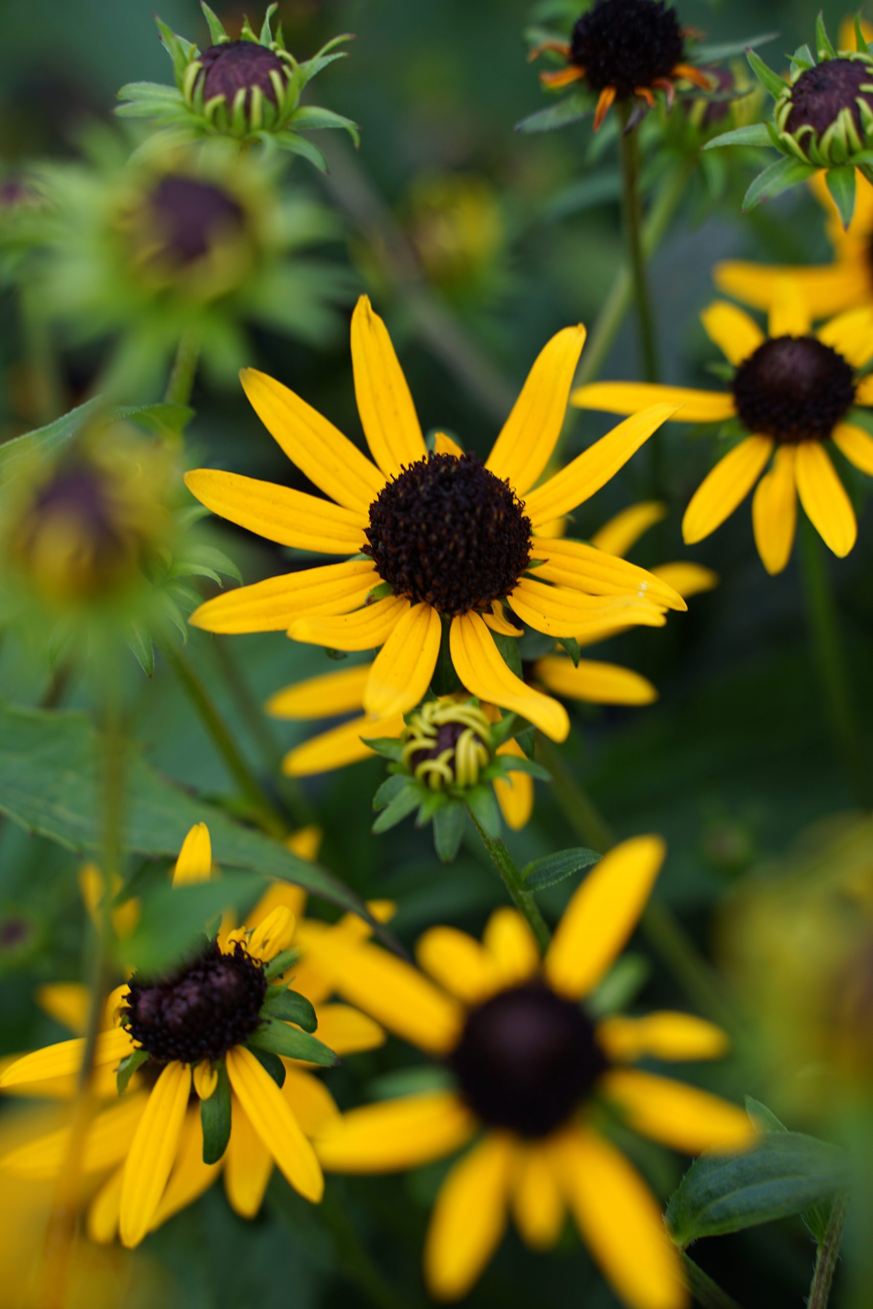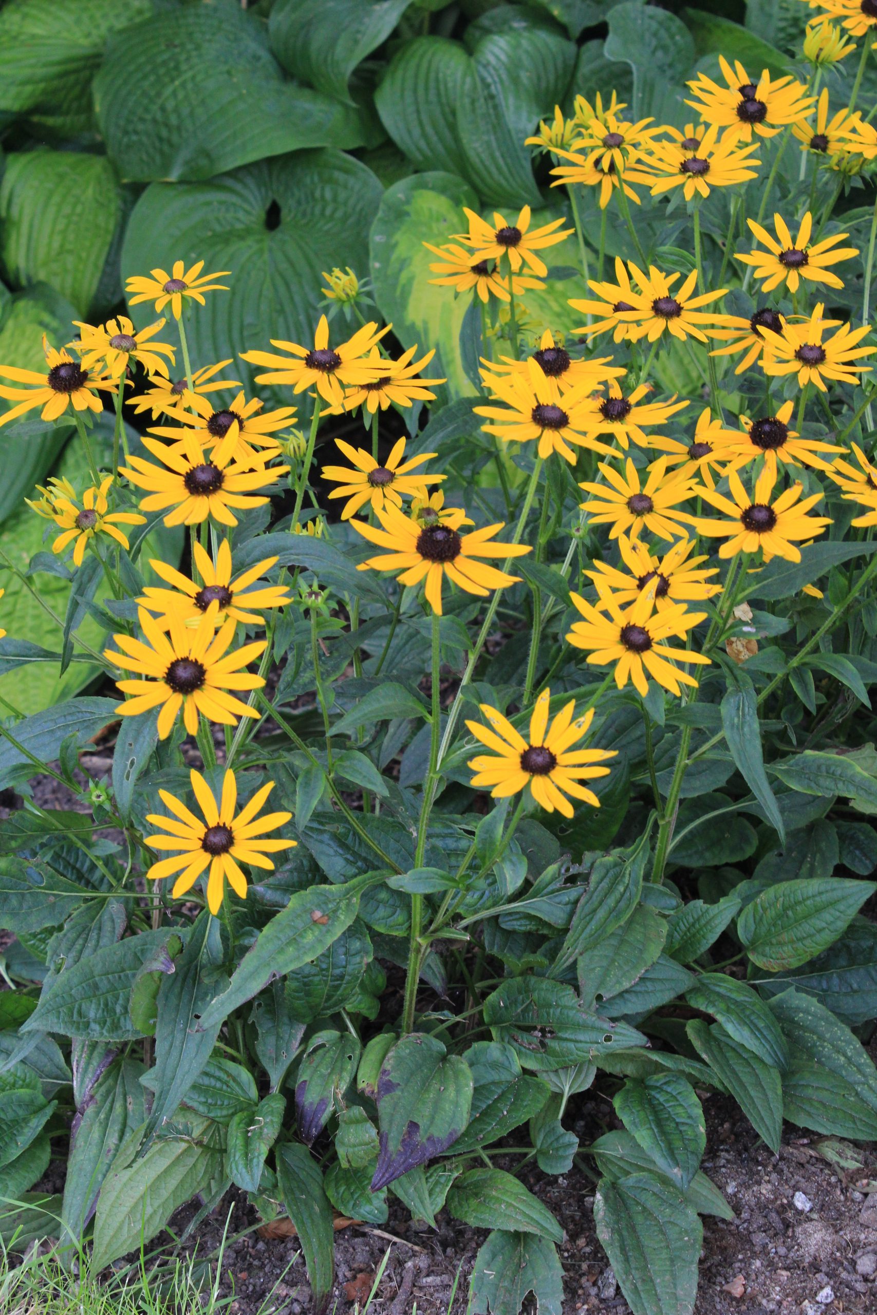 gelb, schwarze Mitte, VII-X, 45 cm, Blatt grün, sonnig, mittel, horstig, Pflanzabstand 40 cm