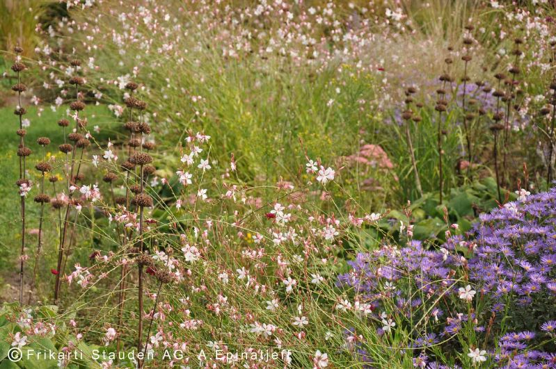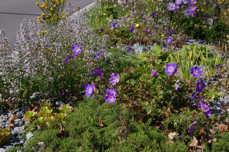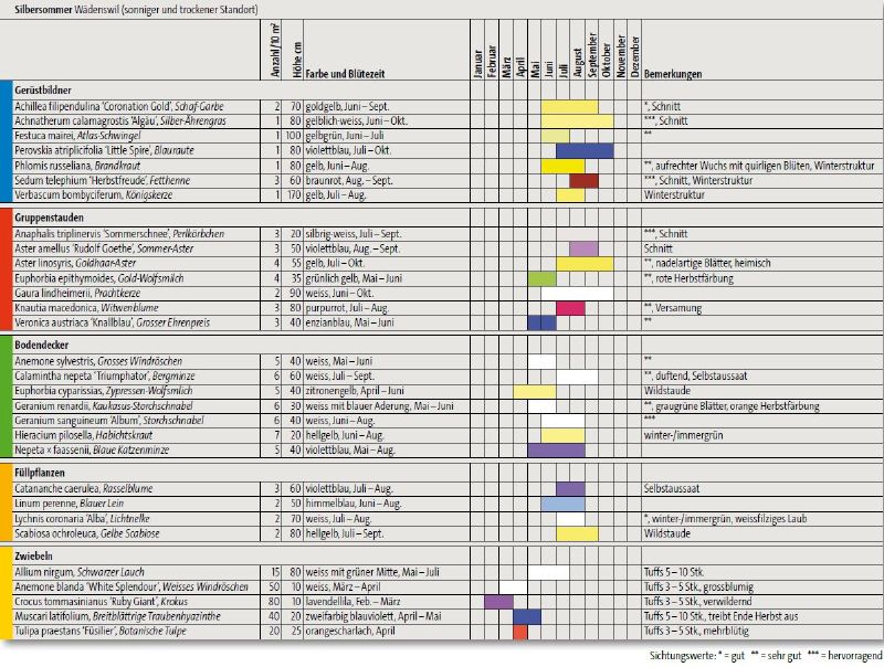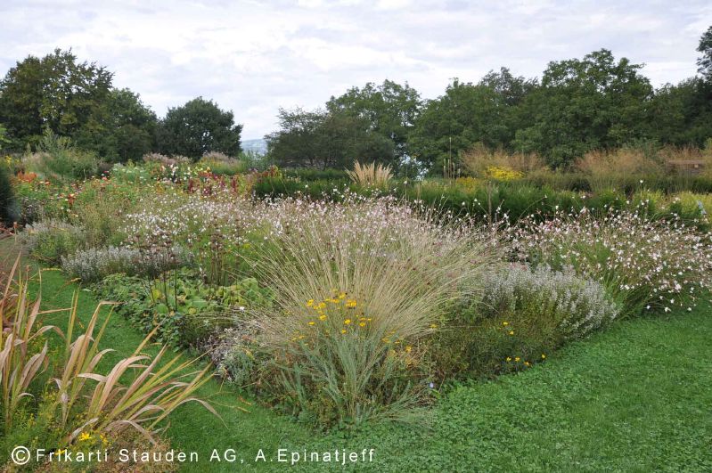 Robuste, attraktive Staudenpflanzung. Sie besteht vor allem aus blauen, weissen und gelben Blüten in Kombination mit silbrigem Laub. Im Winter ist die Mischung durch Samenstände und filigrane Halme erlebniswirksam.