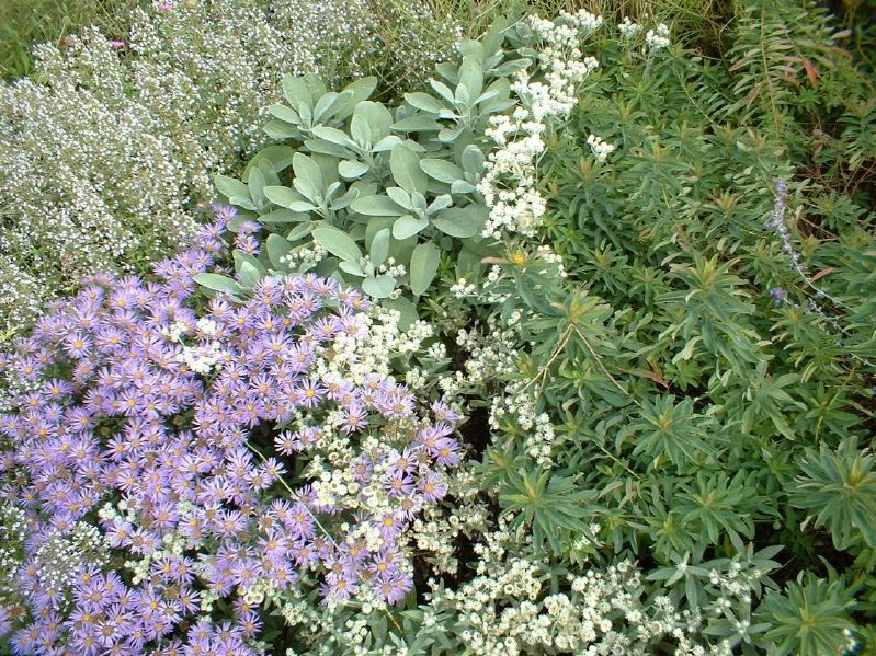 Durch das silberblaue Farbenspiel des Laubes und die wechselnde Pracht der blauen, weissen und gelben Blüten verzaubert die Mischung ihr Publikum zu den verschiedensten Jahreszeiten. Es ist eine sich wandelnde Pflanzenzusammenstellung mit naturnahem Charakter. Zuerst wird die Fläche von Schnellentwicklern eingenommen, die für viel Farbe sorgen, danach werden diese von den langsam wachsenden, langlebigen Arten abgelöst.