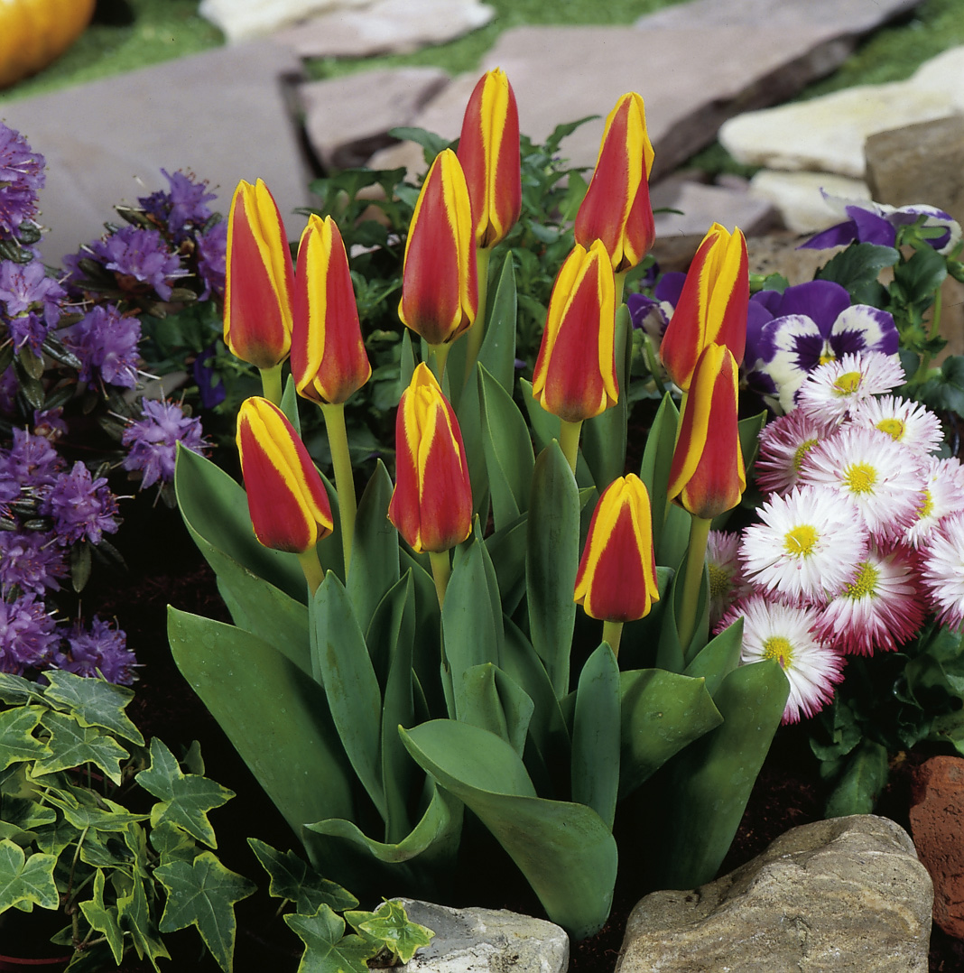 scharlachrot, gelber Rand, innen gelb, III-IV, 25 cm, Blatt graugrün, sonnig, mittel, horstig, Pflanzabstand 15 cm