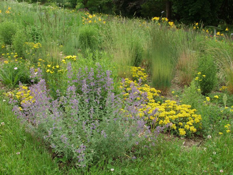 Ansprechende Staudenmischung aus eher schwach wachsenden Arten mit zarter Textur, die vor allem zwischen Mai und September für reizvolle und wechselnde Aspekte sorgen. Die vorherrschenden Blütenfarben sind Gelb und Blau.